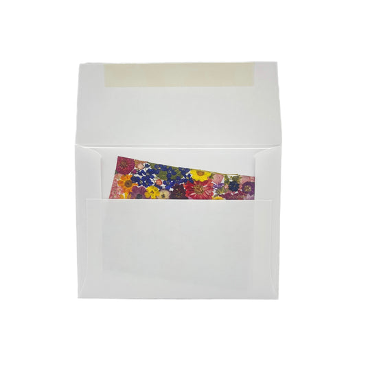 Set of 6 cards with envelopes. Sealed in reclosable crystal clear sleeve. Folded size 4.25” x 5.5”. The notecards are printed in full color using a high resolution image of the original pressed flower state artwork.
